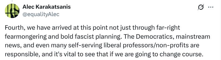 It’s hard to not feel hopeless and of course that’s the point. Here’s a very relevant section from Copaganda, a book I referenced in the last newsletter and likely will reference in every other one for the foreseeable future, written by the guy I just quoted above, Alex Karakatsanis. It’s about how the liberal media, political class and academic establishment have for decades colluded to launder a far-right punishment bureaucracy as some normal and unavoidable fact of life.
