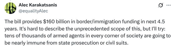 A trespassing charge… that’s all it takes to get you on ICE’s list these days. They’re so desperate to kick up good numbers to the big man they’ll call anyone at all a violent criminal. It’s a very very dark situation when this surveillance dragnet considers every criminal charge cause for removal and local police slap any old criminal charge on anyone they come into contact with… all the trespassings, the drunk and disorderlies, the resisting arrests, the assaulting a police officer…. The routine busy work for the local punishment bureaucracy, keeping everyone well fed and busy, now being used as the raised bed on which to nurture a whole new administrative bloat tasked with solving a fictional problem. People handsomely paid from the federal coffers to look busy solving the insolvable as they create untold new very real problems in every community across the country. I’m not talking in abstractions here. There’s $160 billion in the Big Beautiful Bill the House just passed for the expansion of this forced removal machine.