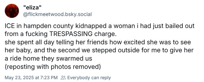 It’s fitting that the Worcester Police Department would provide us two neat local bookends to this national moment, with its two most garish displays of police brutality, excessive force, and cruelty. June 2020: the force marching of protestors down Main Street (the ur-event of this newsletter, by the way). May 2025: the eager partnership with masked federal agents to ensure the forced removal machine runs smoothly—that a group of mothers don’t get in the way of the disappearing of a mother on our streets. Five years and we’ve gone nowhere but backward. Whine of tape rewinding: all the lofty proclamations and equity audits and investigations played in a rapid satanic reverse.