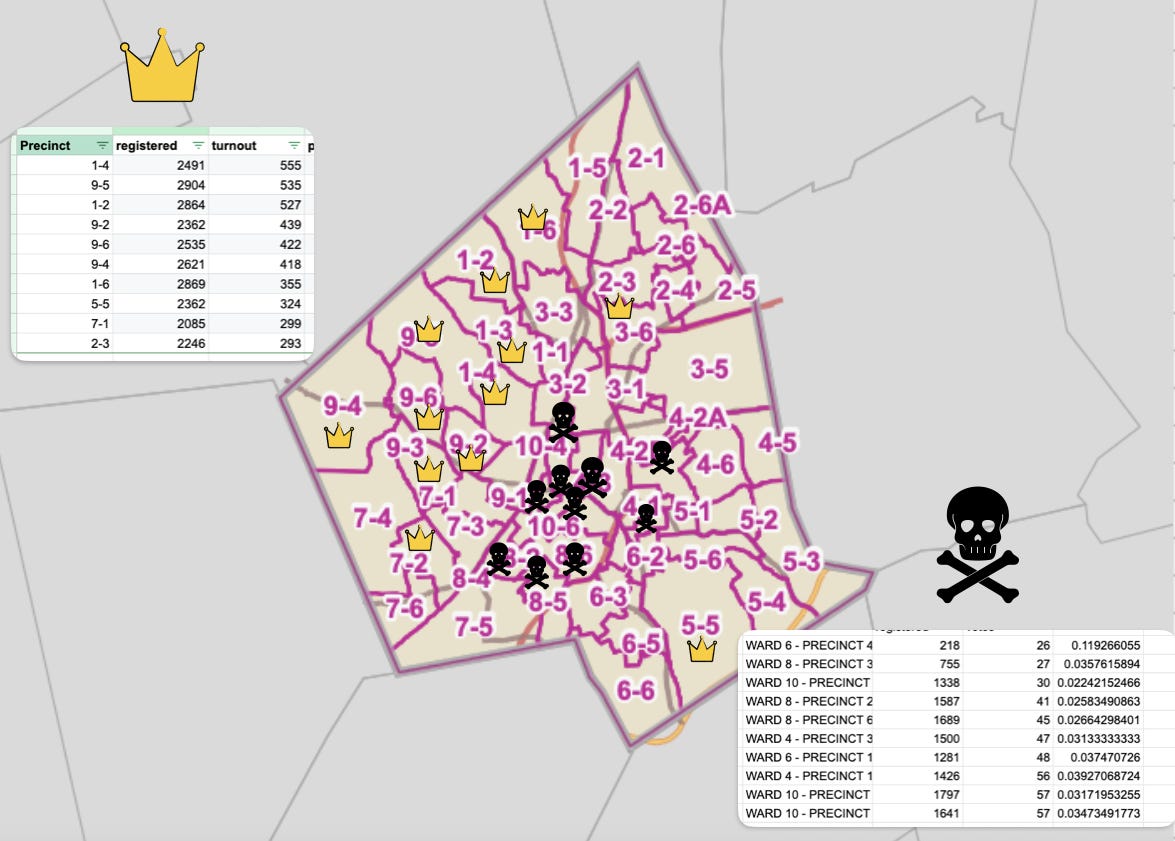 Would you believe it: The top 10 highest-voting precincts in the preliminary election last week were also the top 10 highest median household incomes and the highest rates of homeownership. Would you believe that the top voting district, 1-4, also has the highest median income, at $147,679, and is just a point or two off the highest rate of homeownership, at 78.2.