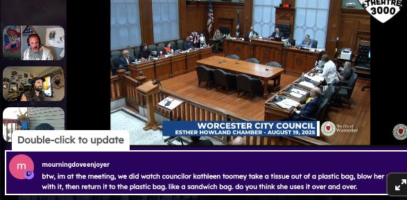 Tonight we have a Kate Toomey doubleheader. She has her 5 p,m. public safety standing committee meeting—last item: the sprinkler ordinance she held at the last meeting for like the sixth time. Then she’ll be kicking off the city council meeting at 6:30 p.m. by calling the thing to a vote. Or trying to. It’s a mess, procedurally. I won’t bore you. However, we will be streaming over on Twitch, you better believe it. (Probably just the council meeting but who knows, maybe we’ll start early. I haven’t checked my phone yet and this post needs to be out the door by noon.)