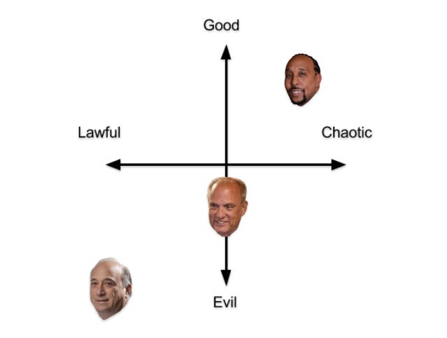 A three-way race between King, Bergman, and Petty would allow us to map the city’s electorate on the D&D alignment axes. And that’s just plain fun. I’ll get us started...