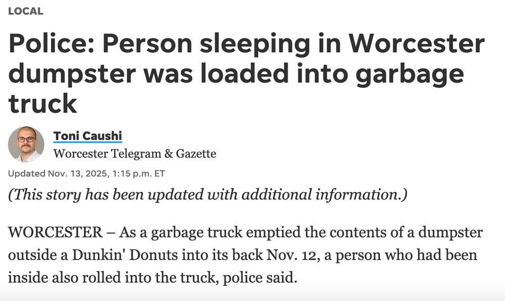 Sometimes you win, other times it’s out of the dumpster, into the garbage truck. Way she goes bubs! Worcester takes an extreme slide into crankdom one week, the next people are getting tossed from dumpsters into trash trucks. Everyone repeat after me: “thank you, real life, for being funnier than satire.”