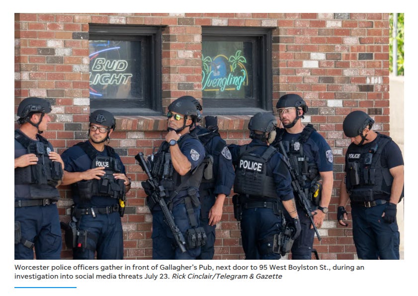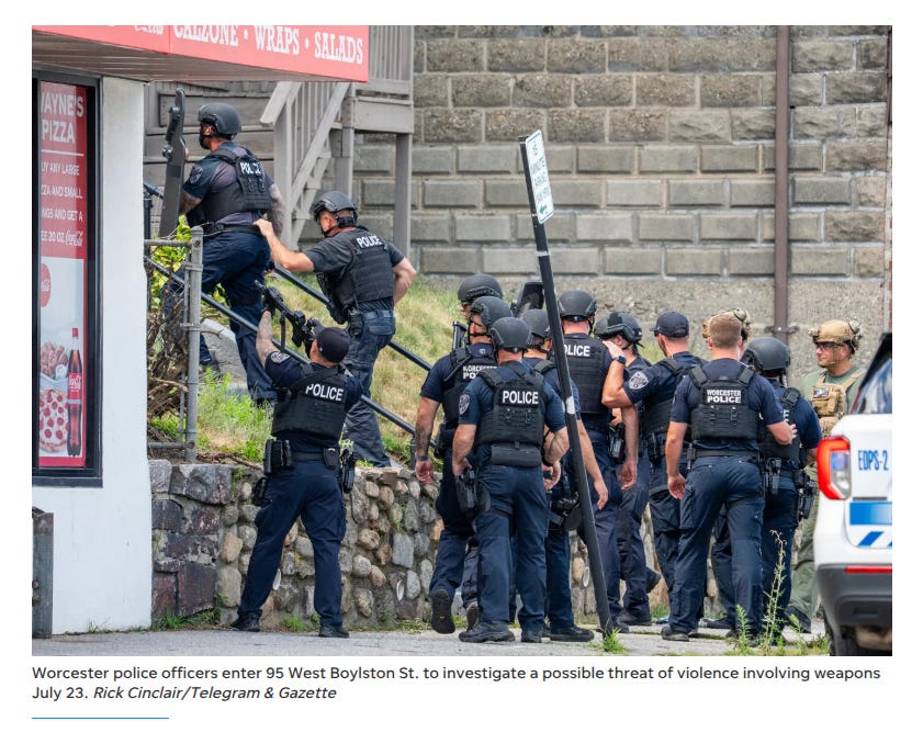 On the same day, a few hours later, a spurious 911 call led the WPD to engage in a three-hour “standoff” (as it was reported) on West Boylston Street. The cops shut down half the city, and the mass engagement of the post-9/11 on-call domestic occupation army made for a climate of fear. As helicopters swirled overhead, the Worcester Police brought out their IDF-style tactical helmets, their long guns, their riot shields, their command center mobile trailers, their drones.