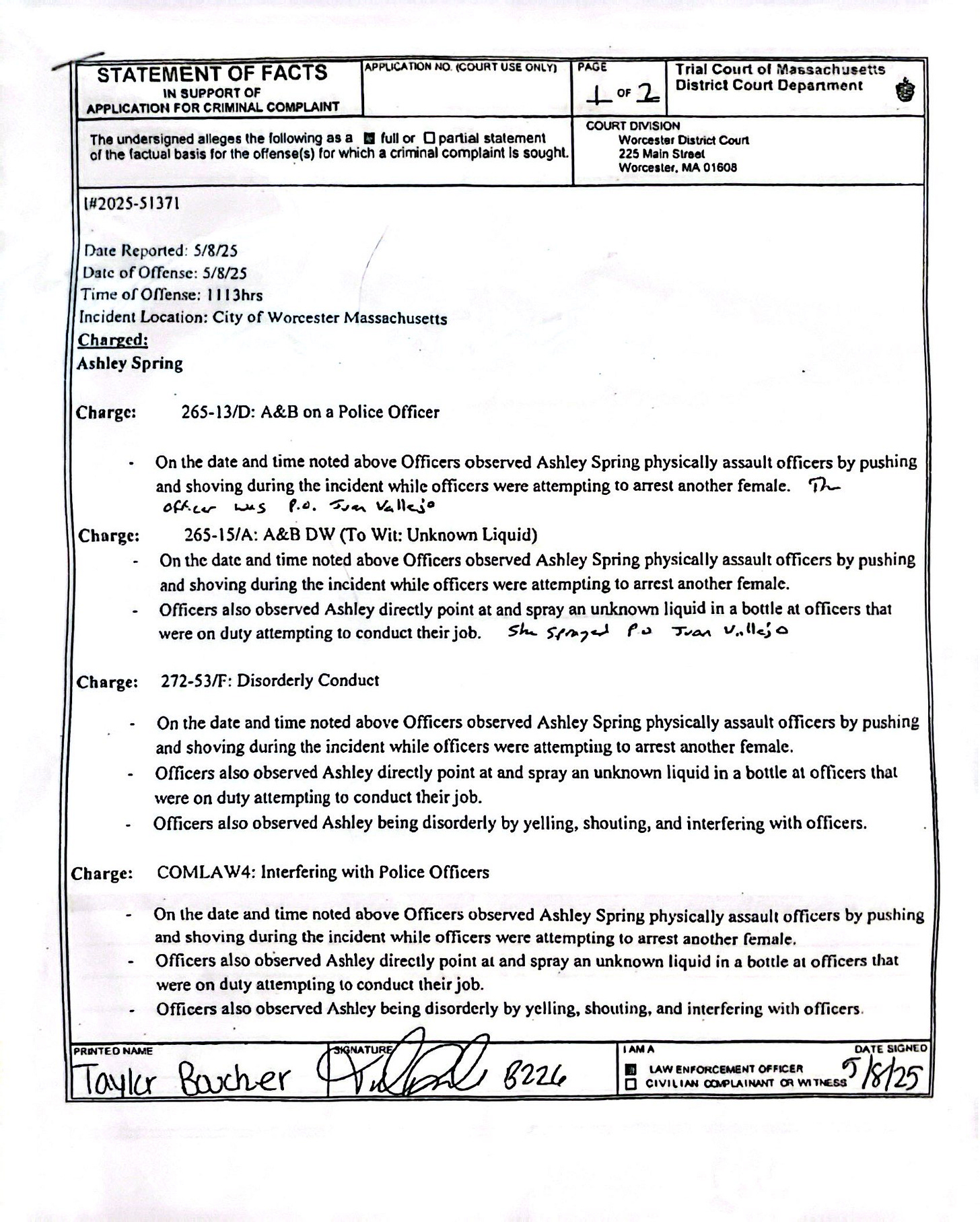 In a terse police report submitted to the DA, WPD Officer Tayler Boucher wrote that officers “observed Ashley directly point at and spray an unknown liquid in a bottle at officers that were on duty attempting to conduct their job.”