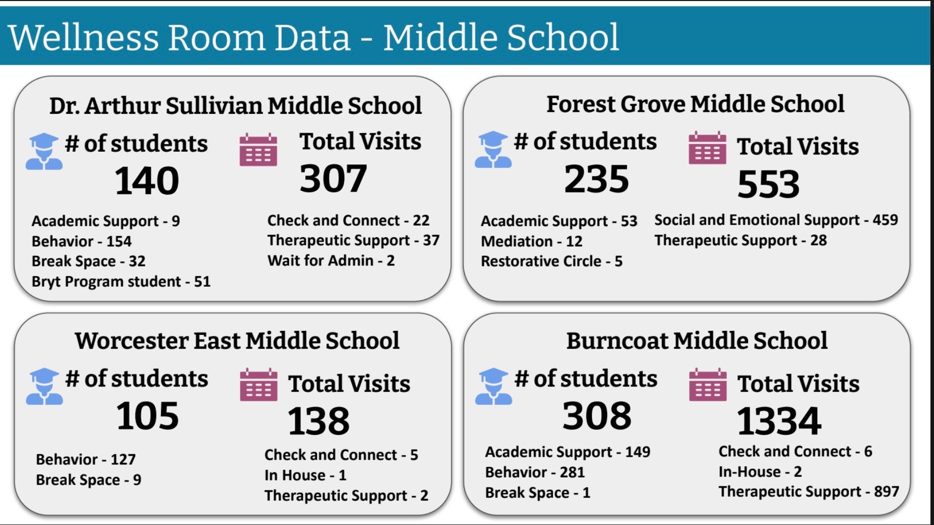 This month’s Report of the Superintendent is on the culture and climate wellness rooms. The rooms are in Worcester’s middle schools and high schools. Also, I missed the rebrand, because up until this year the office was called climate and culture, but I guess it’s culture and climate now.