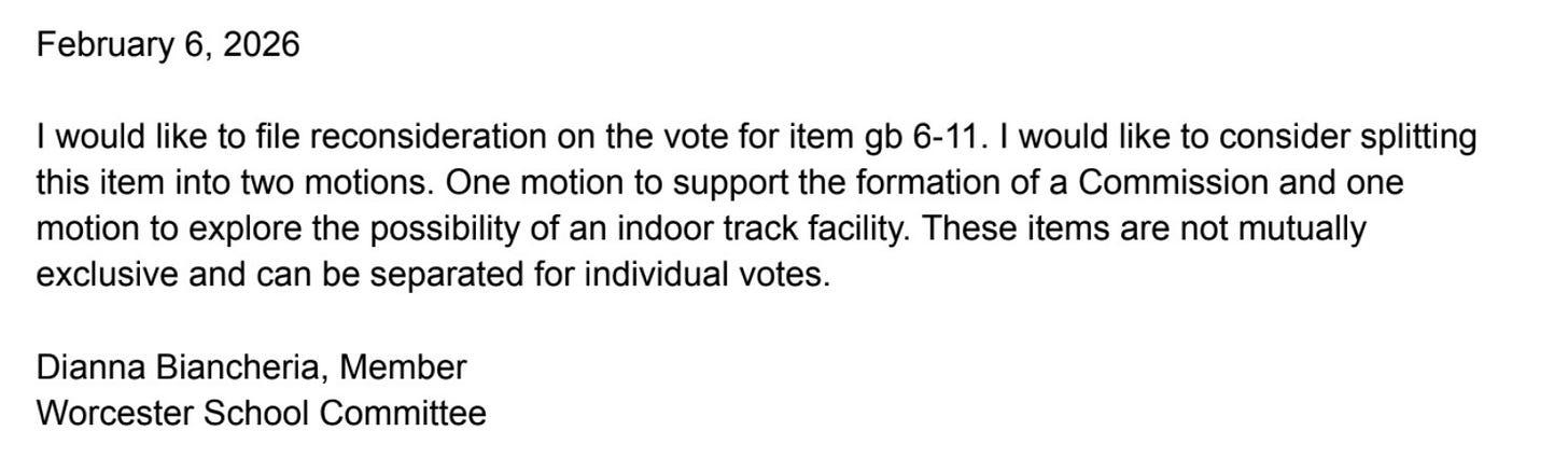 Member Dianna Biancheria (district C) filed for “reconsideration” on an item from the February 6 meeting from Sue Mailman (at-large) that said “To unanimously support legislation filed by Sen Robyn Kennedy S390 - to create a commission to study MSBA to look at the funding process and the award process. Support for such a commission is especially important as we work on plans for a new Burncoat High School and explore the possibility of an indoor track facility.” Reconsideration can be filed within 48 business hours of a vote and according to the school committee rules, a reason needs to be supplied by the requesting member. Here is Biancheria’s reasons (provided in the agenda backup):