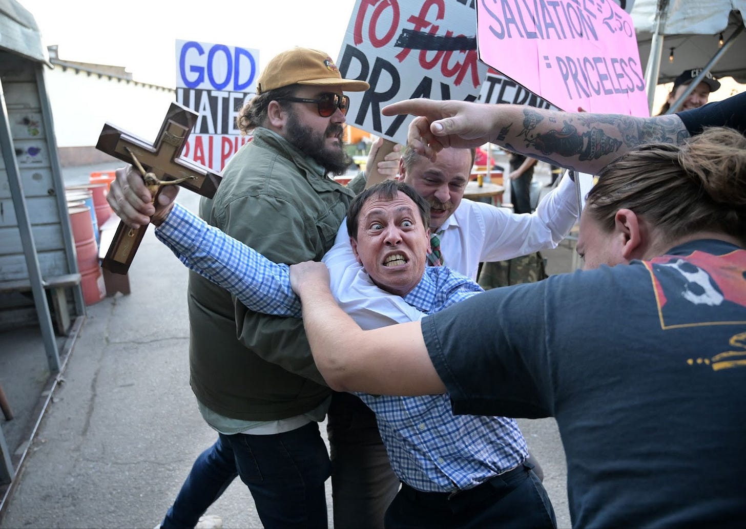 What was an overwhelmingly peaceful affair quickly turned violent as the demonstrators tried to enter the establishment. The group took up “fake blood, real hell” as a chant while Faiths pointed to the entrance of the bar, yelling “charge” repeatedly.