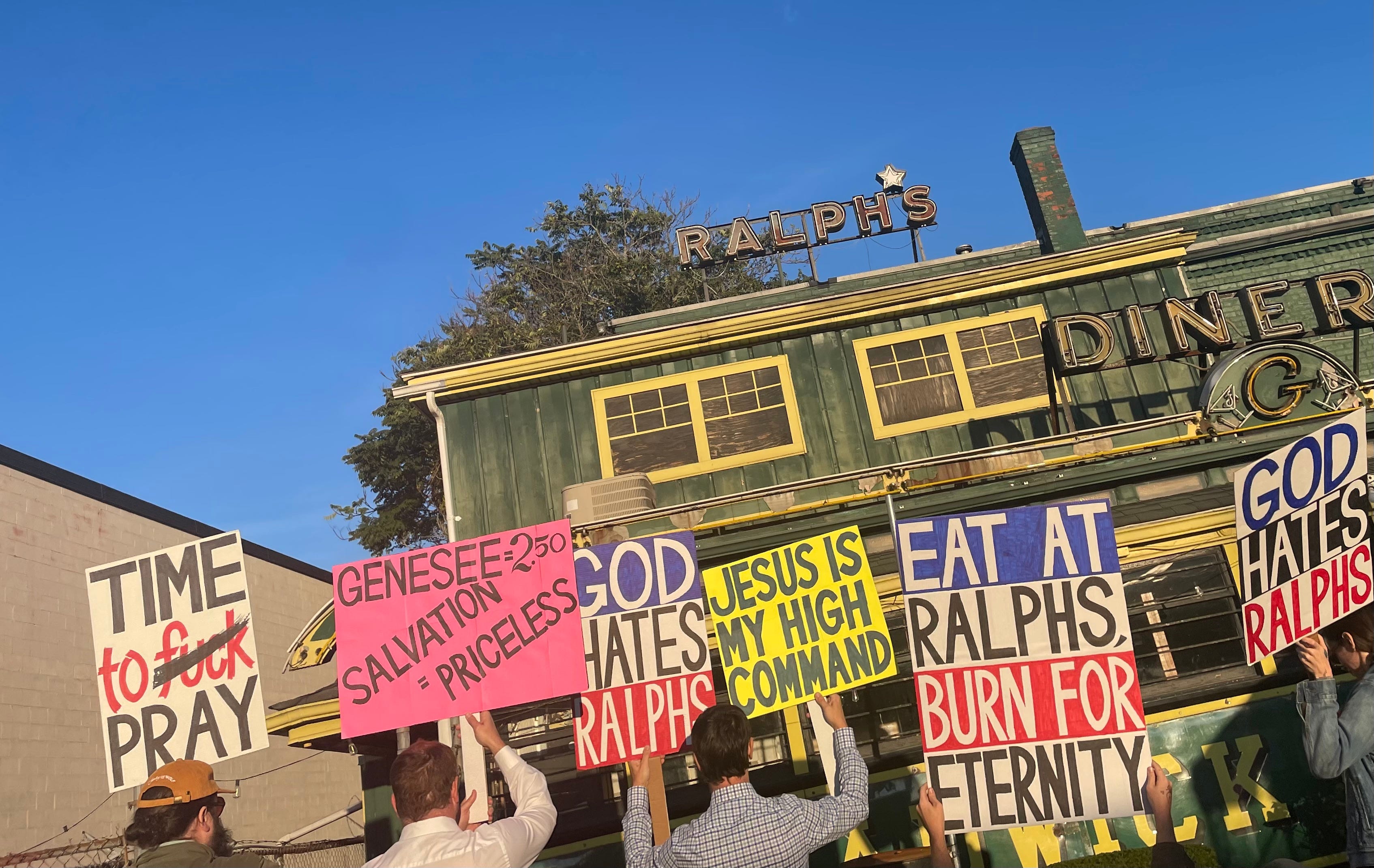 A small group held signs on the patio of the Grove Street dive bar, chanting about a “conclave” of satanism set to assemble at the bar on Halloween weekend, October 27 and 28. The event is called Diner, Drive-In and DIE, and promises “a nightmare beyond the farthest reaches of the imagination.”
