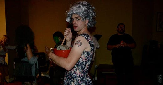 Julia Childs: I wore a Bride of Frankenstein wig, floral patterned dress and heavy lipstick. I carried around a mixing bowl and wooden spoon and at a party I attempted and successfully baked an apple crisp without the host realizing until I pulled it out of the oven.