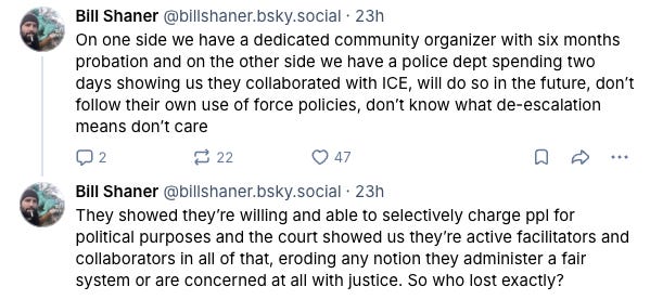 Lastly, for those in positions of power, to the City Council, to the Mayor, and to the City Manager: You could have stopped this injustice that masqueraded as justice. You could have all lent your voices and reigned in a police department and a police union that acted with vindictiveness and malice. The fact that you stood on the sidelines and let events play out as they did, events that will chill the ability and desire of our neighbors to help each other in times of crisis, in an era when we need to lean on each other even more, is more of an indictment against your collective characters than against the passionate civilian that our legal system saw fit to punish.