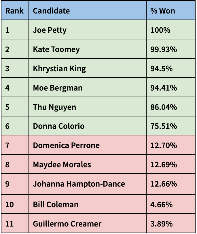 I used this data to create a statistical model that I could feed into a computer simulation. For each candidate running this year, I calculated the percentage of voters that preferred that candidate in past elections. Next, I calculated standard deviation, which is just a fancy term for measuring how much random change in popularity that a candidate is likely to experience year to year. For first-time candidates (Hampton-Dance, Morales, Perrone), I used data from past first-time candidates to guess the minimum and maximum possible range for a newcomer. From there, I could simulate an election by randomly calculating what percentage of voter share each candidate was likely to get. Then, I ran that simulation a million times to figure out each candidate’s likelihood of winning one of the six seats.