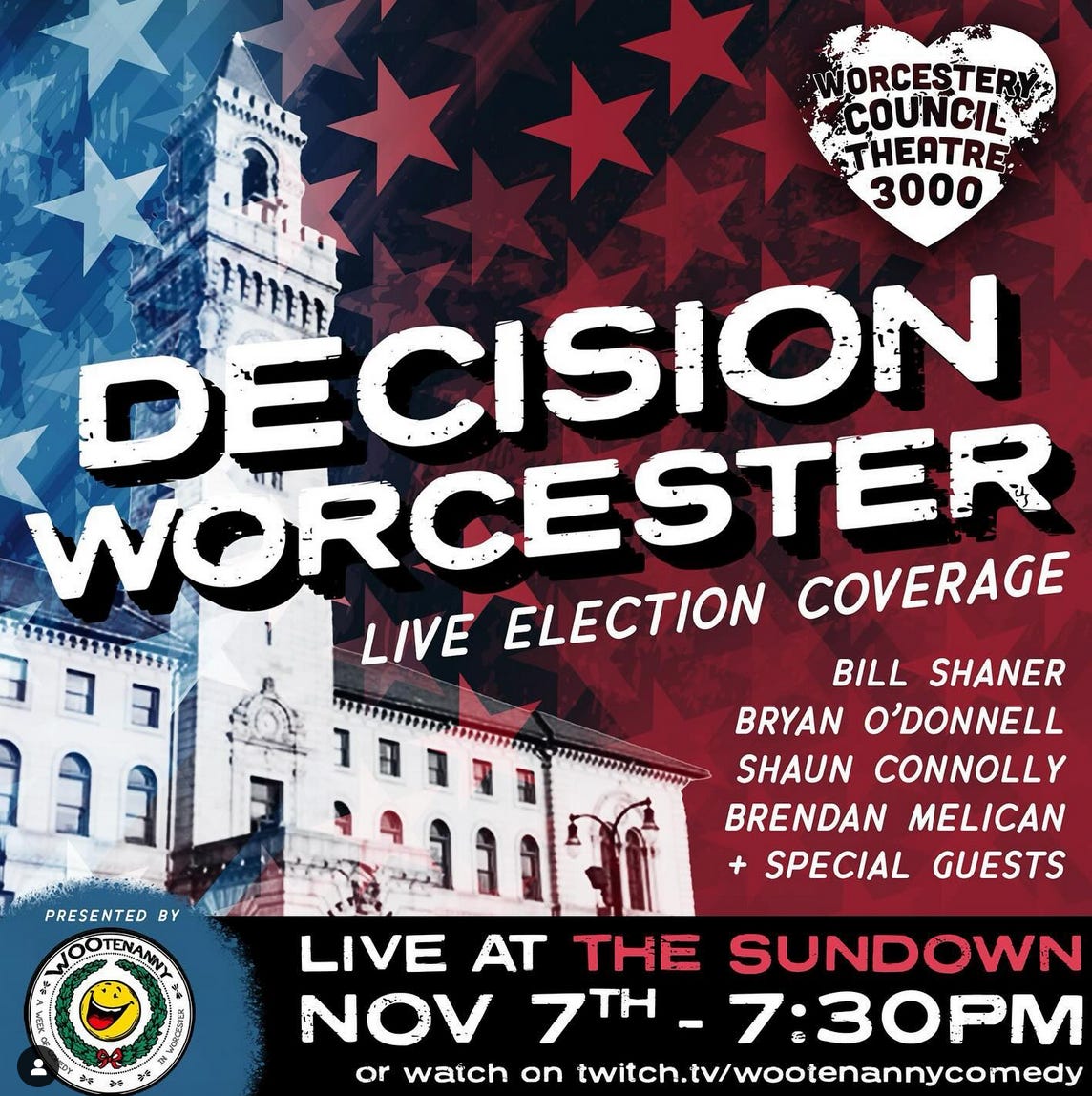 And don’t forget: Tonight, the Worcestery Council Theatre 3,000 boys are holding a live event! At The Sundown (the old Dive Bar, 34 Green Street), starting at 7 p.m. It’s free and open to the public. Come down and join in on the fun! Woohoo!