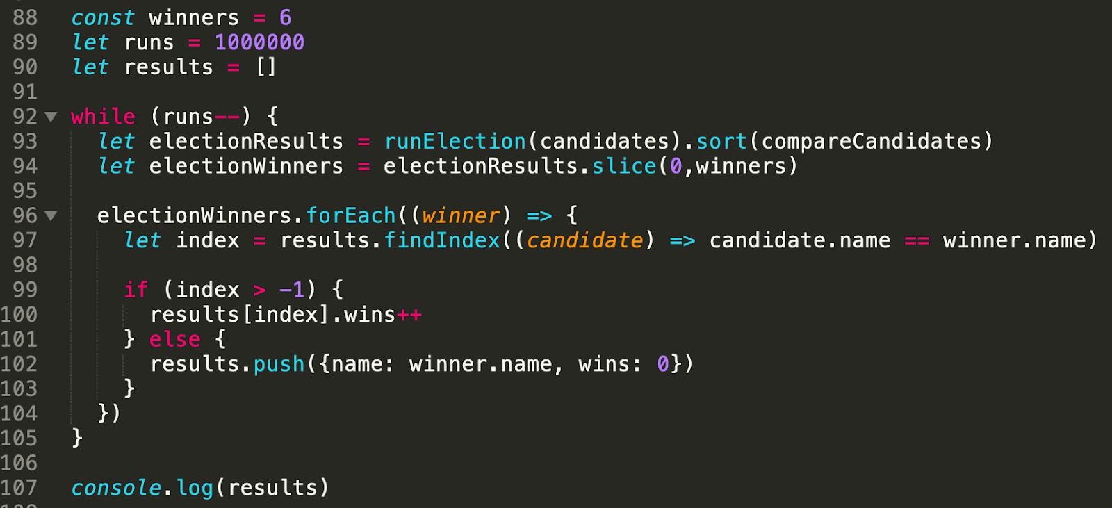 Out of a million simulated elections, here’s the percentage of elections each of the candidates won: