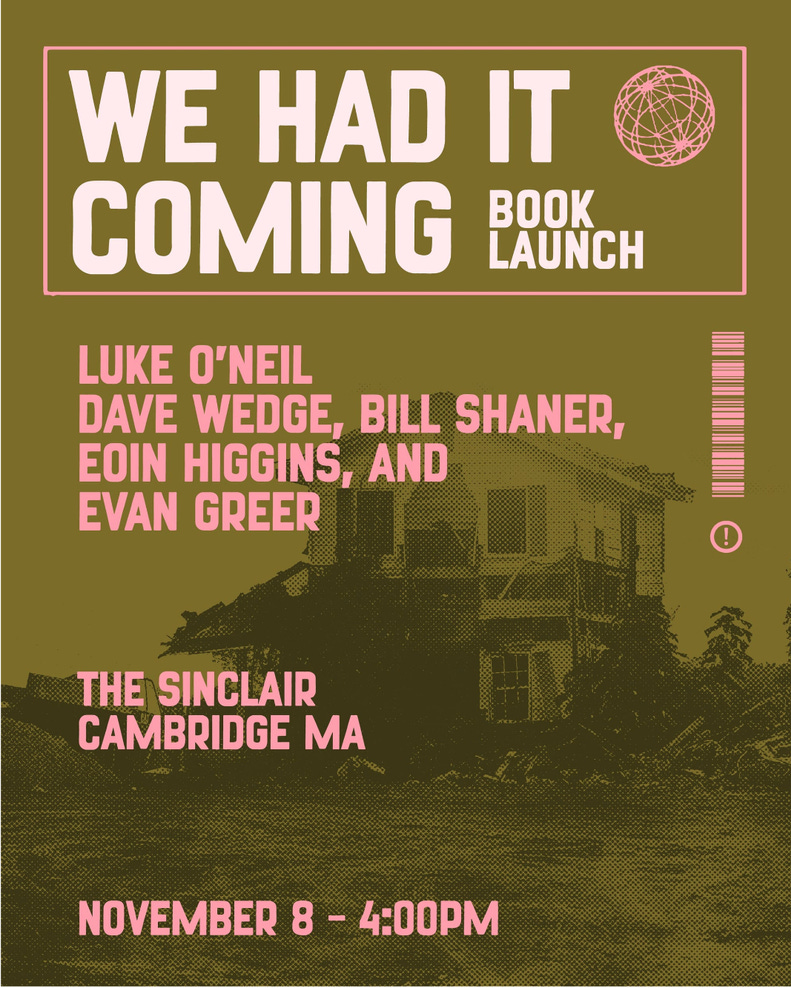 One last thing: I (Bill) will be at the Sinclair from 4-6 p.m. on Saturday, reading some of my work, sharing a stage with some of the most talented writers I know. It’s the book launch party for Luke O’Neil’s new one, “We Had It Coming,” a book that is devastatingly good for anyone but especially for someone who grew up in Massachusetts amid the townies and the decay and the ‘do your job’ fascism.
