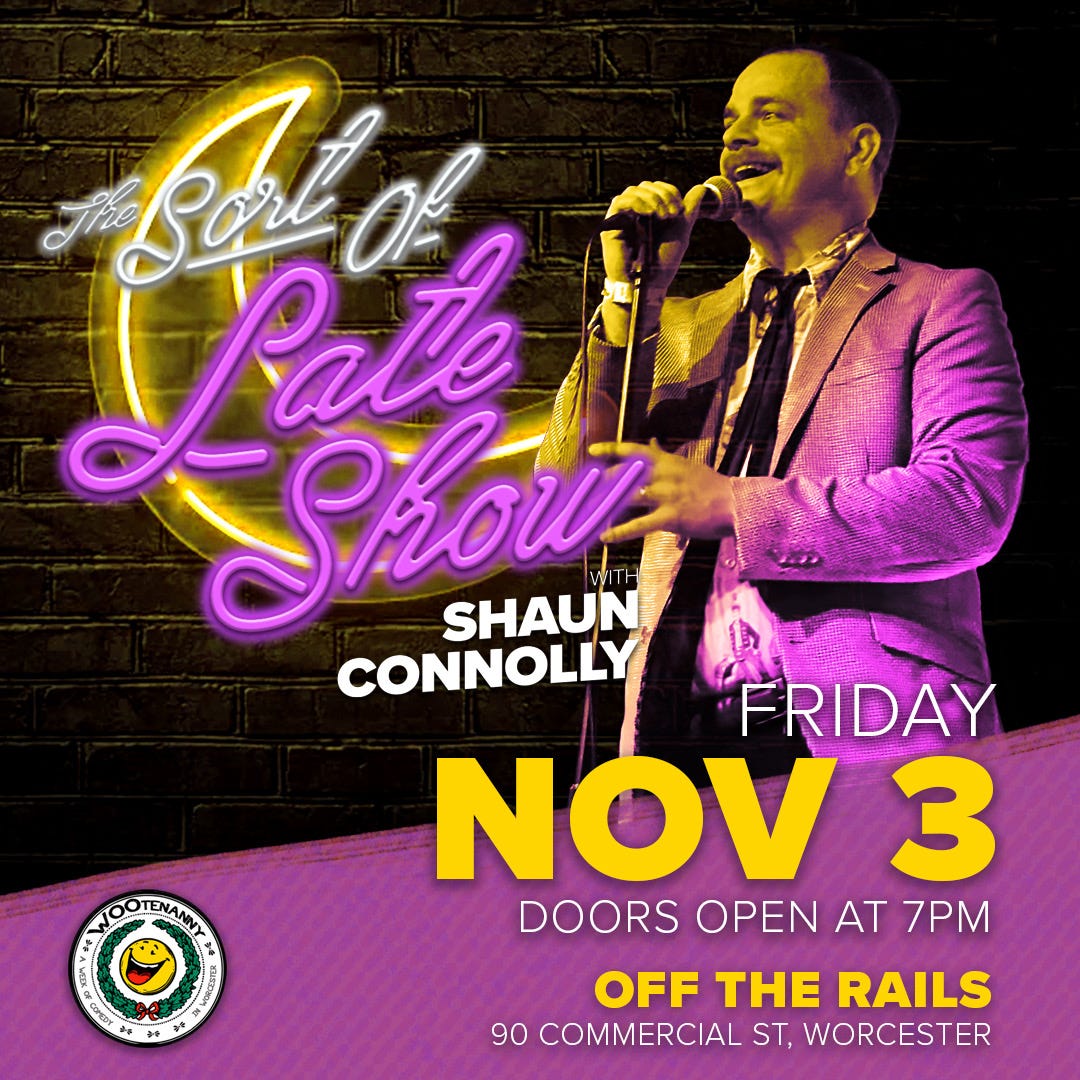 Also! The Sort of Late Show is back! It is Worcester’s take on The Tonight Show and it will be at Off the Rails. Get your tickets here! We have done this show for 10 years now and it is one of my favorite things that I’ve ever done. We’ll have house band Bad at Sex and band leader Bryan O’Donnell. We’ll have special guests, Bill Shaner and Jenny Pacillo. We’ll have comedian Dan Perlman (Showtime). We’ll have the incedibly talented band, Moshi. All on November 3rd! Here’s the gorgeous poster by Travis Duda!