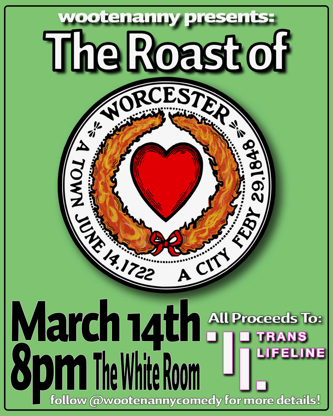 I am so excited for Friday March 14th. It is our 4th annual Roast of Worcester and it will be at The White Room in Kelley Sq. It is a fundraiser for Trans Lifeline. We’ve got comedians Bryan O’Donnell, Cam Ohh, Doug Guertin, Nate Hilli and Liz Dufrense performing. Worcester residents Doug Arbetter, Molly O’Connor, Sam Mensah and Bill Shaner performing as well. It is a suggested donation, and you can reserve your spot right now. Flyer below!