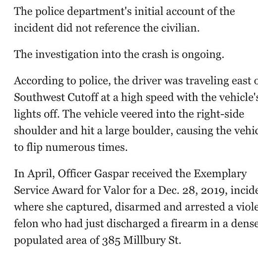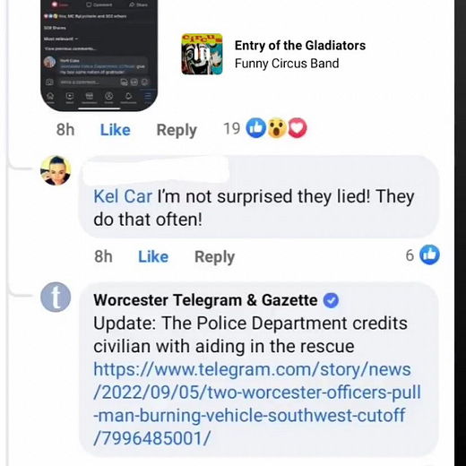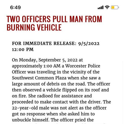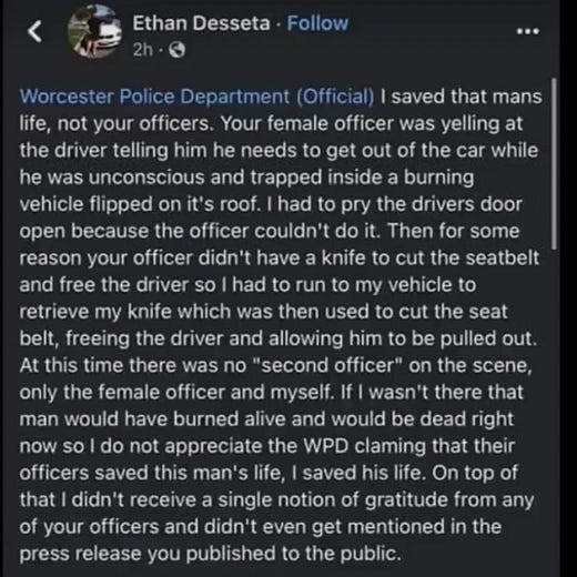 Earlier this week the cops put out a press release alleging that two Worcester police officers saved a man from a burning car. The release was dutifully reported out by the Telegram and MassLive as is tradition. Then a guy named Ethan Desseta put up a Facebook post saying he was actually the one who did all that while an officer watched. “I saved that man’s life, not your officers,” the post reads. “Your female officer was yelling at the driver telling him he needs to get out of the car while he was unconscious and trapped inside a burning vehicle flipped on its roof.” He was the one who pried open the door and cut the seatbelt, he said. There wasn’t any “second officer” on the scene until after the fact.