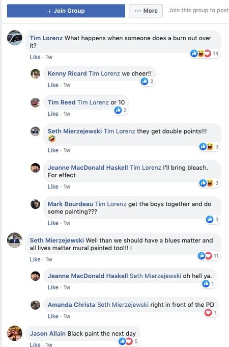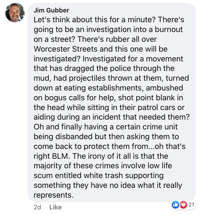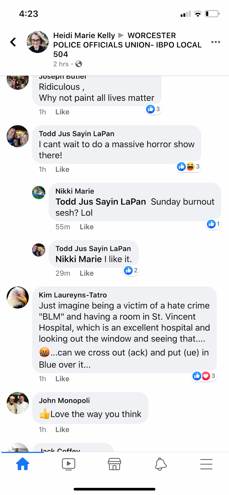 The clearest example of this and, coincidentally, the most obvious and overtly racist thing that happened this week is the burnout over the BLM mural on Major Taylor Boulevard and the subsequent mind-numbing discourse on Facebook. Let's take a quick look at my favorite place on the internet, the Worcester Police Union's Facebook page, where it was the worst. It's always the worst there it seems. Like I said, Thought Moat.