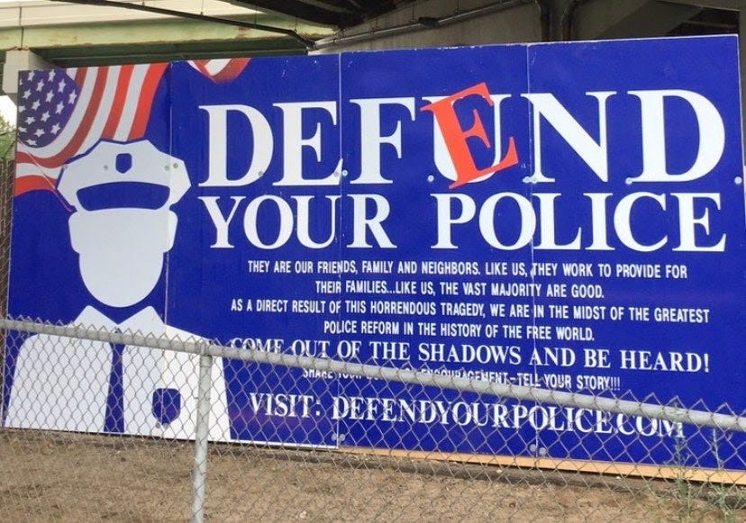 Accompanying this push to get a Punisher logo mural outside the police station is the emergence of a very large and very stupid "Defend Your Police" billboard in Washington Square, across from Union Station. This is another racist thing that happened this week, by the way. If you don't think it's racist you're on the other side of the Thought Moat and I'm not going to waste any time explaining why.