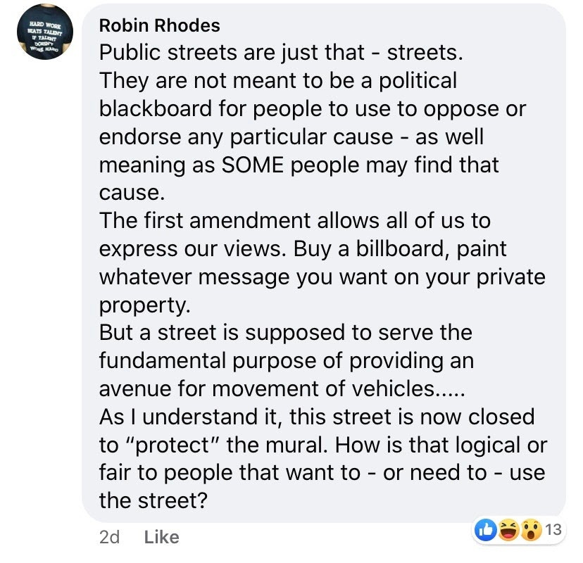 Still, none of that stopped the townies from letting us know how they feel about it, and how they feel about it oscillates from no big deal to hell yeah, brother. Lest we forget that last week they basically made plans to do burnouts on the mural on the very same Facebook page.