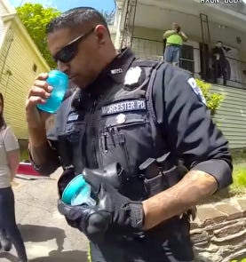 While the above moment takes the cake for me, honorable mention is the sweet-seeming elderly woman driving past the scene, who leans out of her car window at one Officer Juan Vallejo and says “I hope you’re happy with yourself,” in the particular brand of singular Worcester snark. The Masshole bless your heart. The comment takes him so off guard he obviously swears at her, but the feed is muted, and the stated reason given at the bottom of the screen is that the identity of a 16-year-old was at risk of being divulged. The same 16-year-old he’d just tackled and kneeled on moments prior.