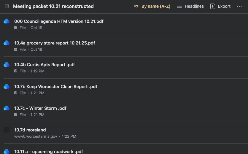 There’s a city council meeting tomorrow. The new agenda system is still soooo bad. So yesterday, I rebuilt it (pay attention to this, Eric) with a simple folder of hosted PDFs with standalone links, labeled in a way that makes sense: Meeting packet 10.21 reconstructed.