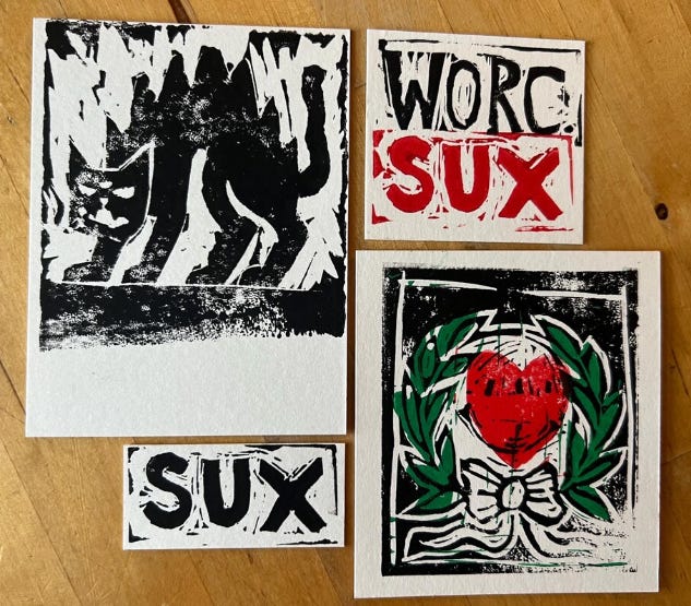 And the Worcester Sucks linocut prints on Katie’s site too!