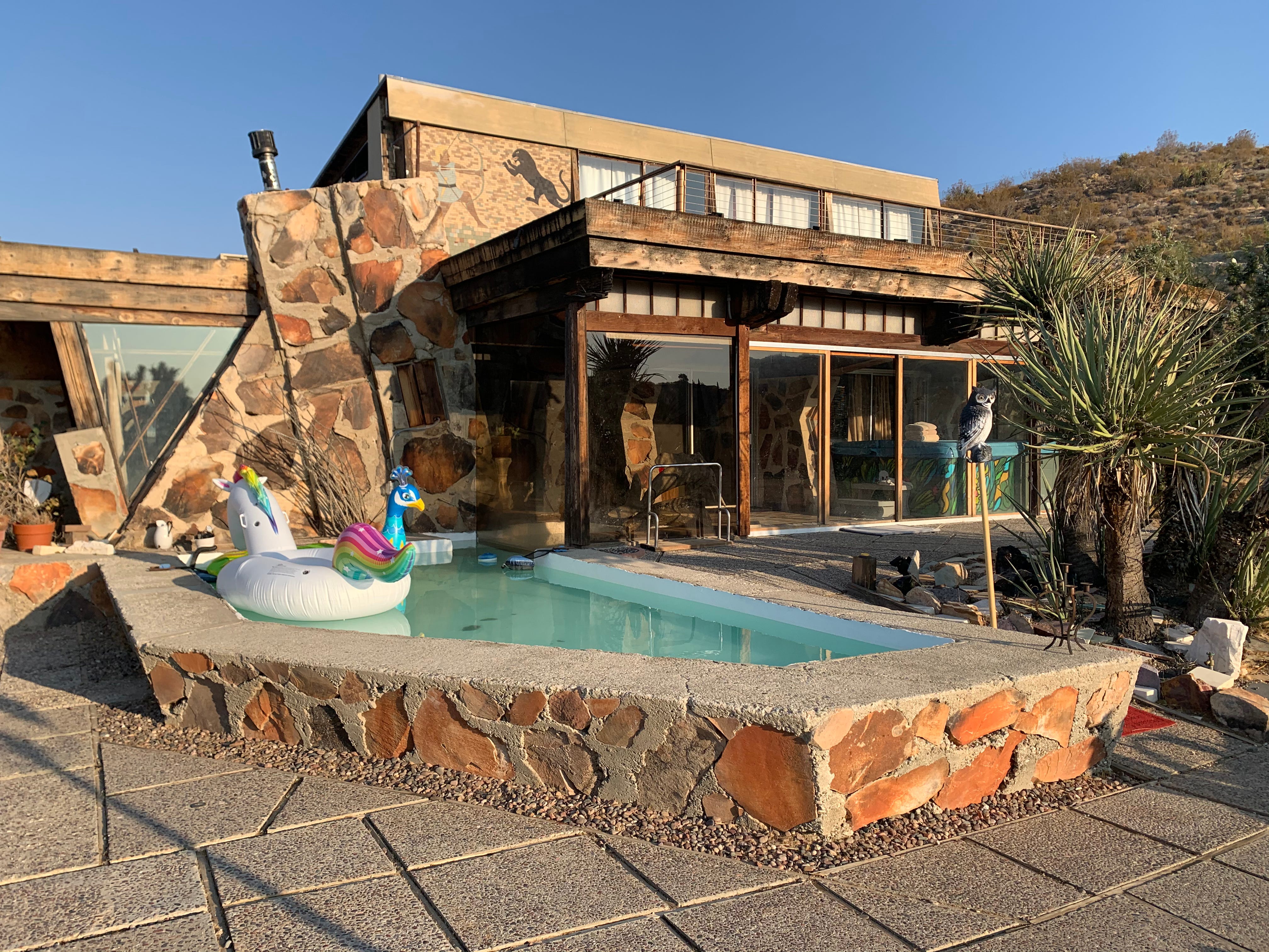 Last night was one of the more surreal party nights I can remember. I’ll save the details but suffice it to say it involved a lot of psychedelics and nudity and the hot tub overflowed into the house. The house itself is a desert coke paradise. Unreal. The master bedroom in the living room. Egyptian theme and tiling. A huge tub in a huge bathroom. An open air porch in the middle of the house with ponchos for wearing. A camper in the back decked out in celestial decorations, fit to be a trip paradise. An archery range in the front yard and quails rustling in the bushes that dot the property.