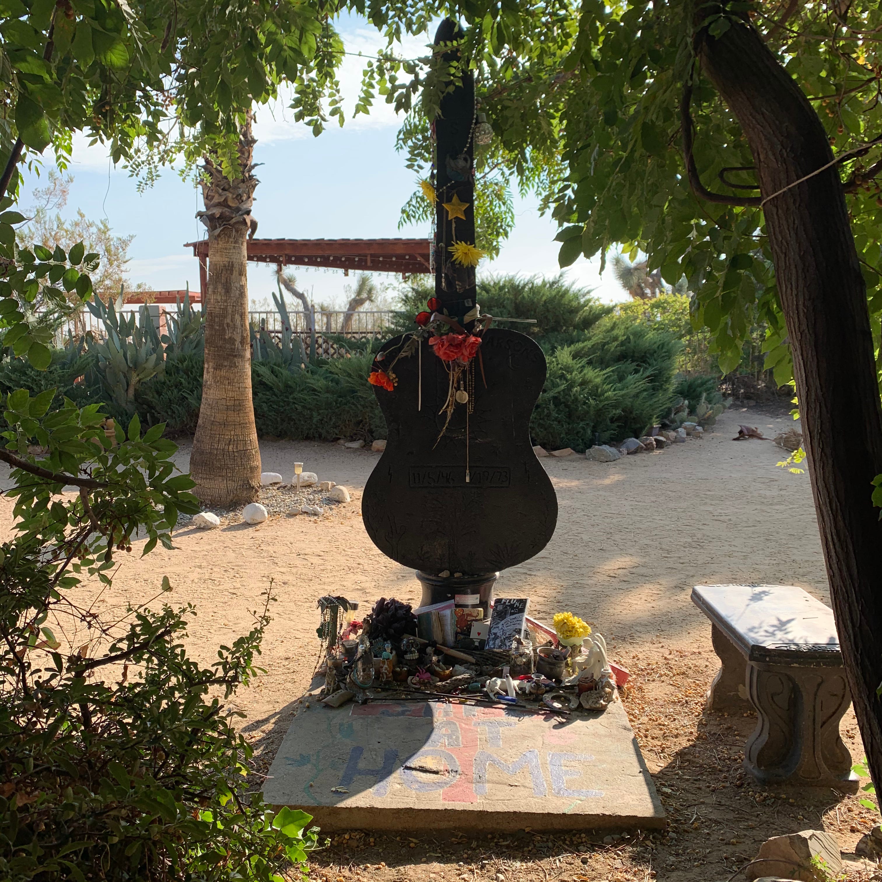 I shotgunned a beer in front of Gram Parsons’ memorial last night. This morning I woke up and spent some time with it. It says “safe at home” and so many people left little knickknacks. There was a zine with an interview with Nate Powell, one of my writing heroes. There was a goodbye note to a dead friend. There was a handwritten journal of desert acid experiences that focused heavily on DJ Khaled for some reason that I’m sure was extremely funny to everyone involved. There were a lot of lighters and a few old violin bows, worn and stripped of their hair, and a white ceramic horse. I left a white lighter and an ace of hearts from my deck of cards. To see the way this man is honored in the weirdo tradition he helped create was really touching. I like it here. I could live here. That kind of energy is what I think I could use. I hope one day I make something beautiful enough that people would want to do the same for me.