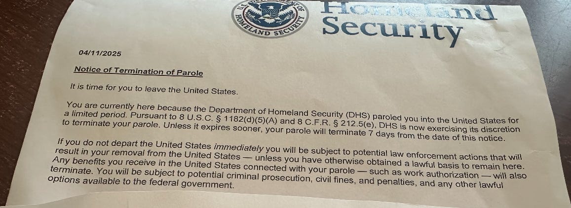 On Friday I got a heads up from someone at a local service provider for the unhoused that someone there received an email with the subject line “Notice of Termination of Parole” from the Department of Homeland Security. The first line “It is time for you to leave the United States.”