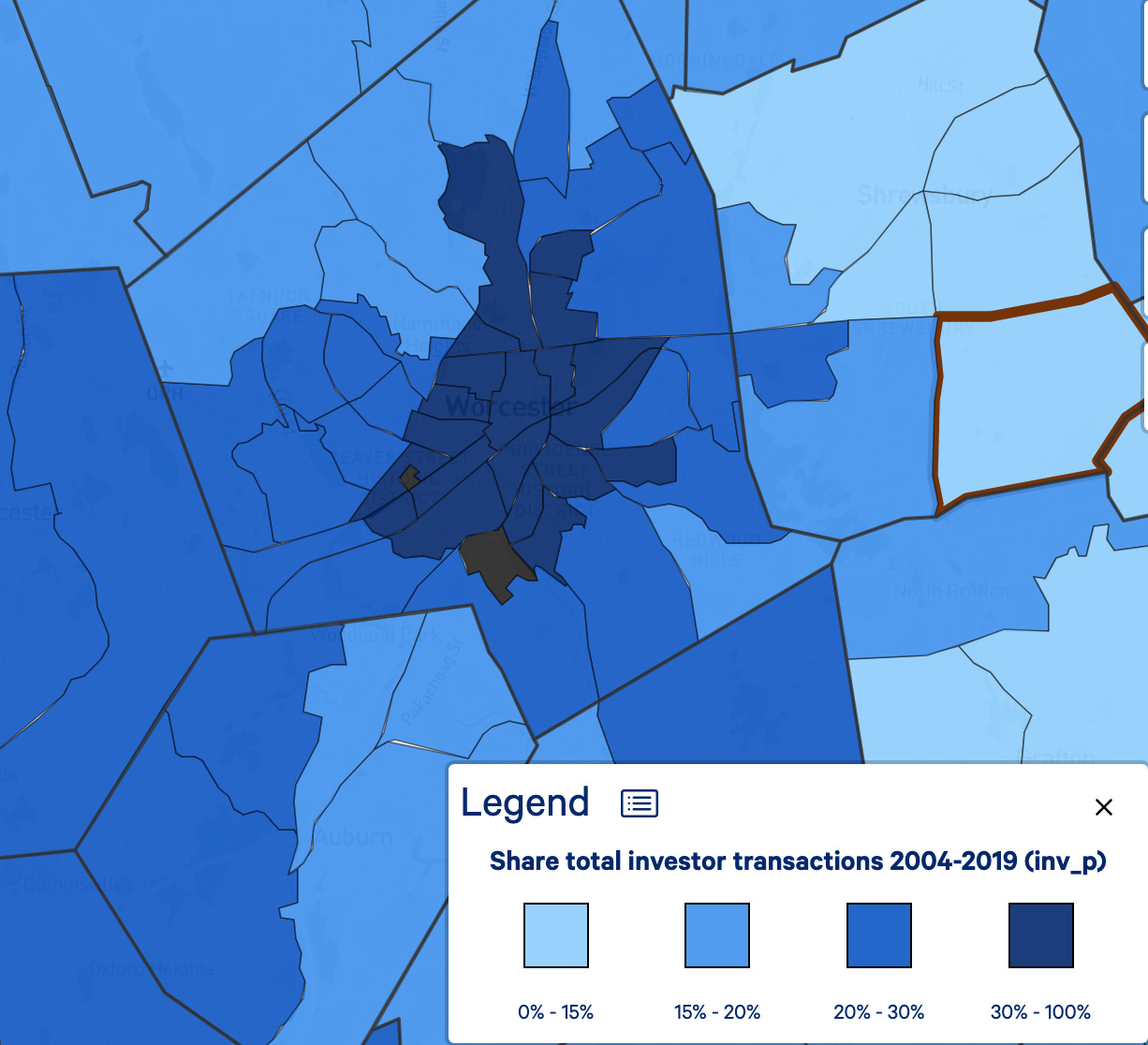 Between 2004 and 2018, the period they studied, they found that 21 percent of the property purchases in the greater Boston area were made by speculators. A little less than half of these properties, at 9 percent overall, were flipped within two years, yielding returns anywhere from 55 to 85 percent. Nice work if you can get it. What flipping does, however, is take affordable homes off the market, and in the areas that need them most. Like most evil things, this is a phenomenon that hits low income areas harder, as is evidenced by a map the group attached, updated as recently as 2024.