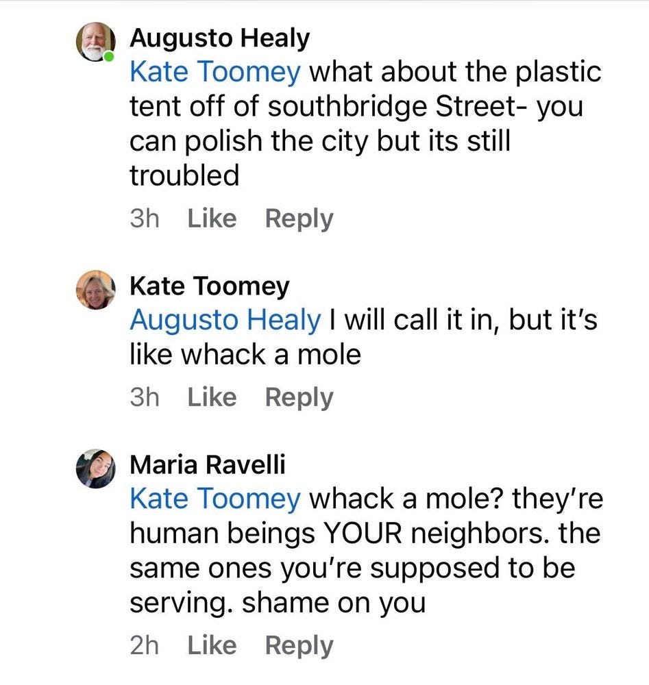 The “those,” by the way, includes the majority of the Worcester City Council, now campaigning on the need to “get back to business,” not focus on such things. “Distractions,” they’ve come to euphemize.