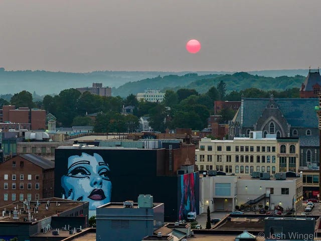 And here’s maybe the prettiest picture of Worcester ever taken? A drone shot by local photographer Josh Wingell. I saw it on the Worcester Subreddit. Wingell: “Taken yesterday evening (8/5/25) with my drone. The sun was an incredible bright red, thanks to the Canadian wildfires.”