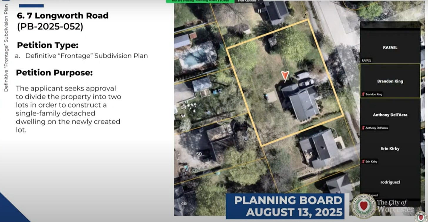 This applicant could, by right, build an accessory dwelling unit today if more housing were the true goal. Instead, the home at 7 Longworth Road remains empty while the applicant seeks to subdivide the lot, build new construction and inflate the value of the existing structure by holding it off the market. This is a strategy seen in speculative real estate markets where artificial inventory scarcity is used to drive prices upward.
