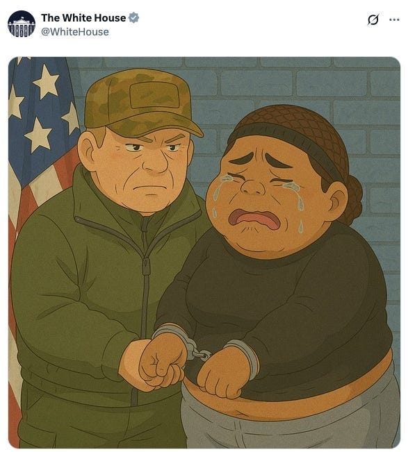 Hmmmm... use of a new media form to engender a mass psychosis among a population? You don’t say! What immediately came to mind was the White House Twitter’s Ghiblification of a deportee—using tacky AI art to make a meme of a woman’s ruination, posting it on a platform where people are encouraged to gleefully participate in the cruelty with the “like” button. As of my writing at least 161,000 people have done so.