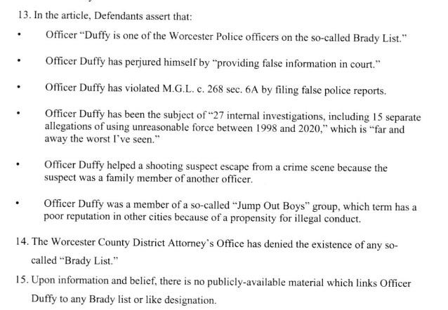 Also Duffy’s lawyer removed the attribution from the Brady List quote referenced in the lawsuit. The full sentence reads, “According to sources inside both city and state government, Duffy is one of the Worcester Police officers on the so-called Brady List.” A safely protected statement if there ever was one. But that’s what you get when you use a personal injury lawyer (Rafferty) to attack the First Amendment, as a public figure going against a journalist no less. You are out of your element, Donny.