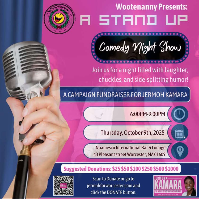 Tonight WOOtenanny is hosting a stand up comedy fundraiser for Jermoh Kamara at Noamesco. It starts at 6 and we have some great Worcester comedians on the show.