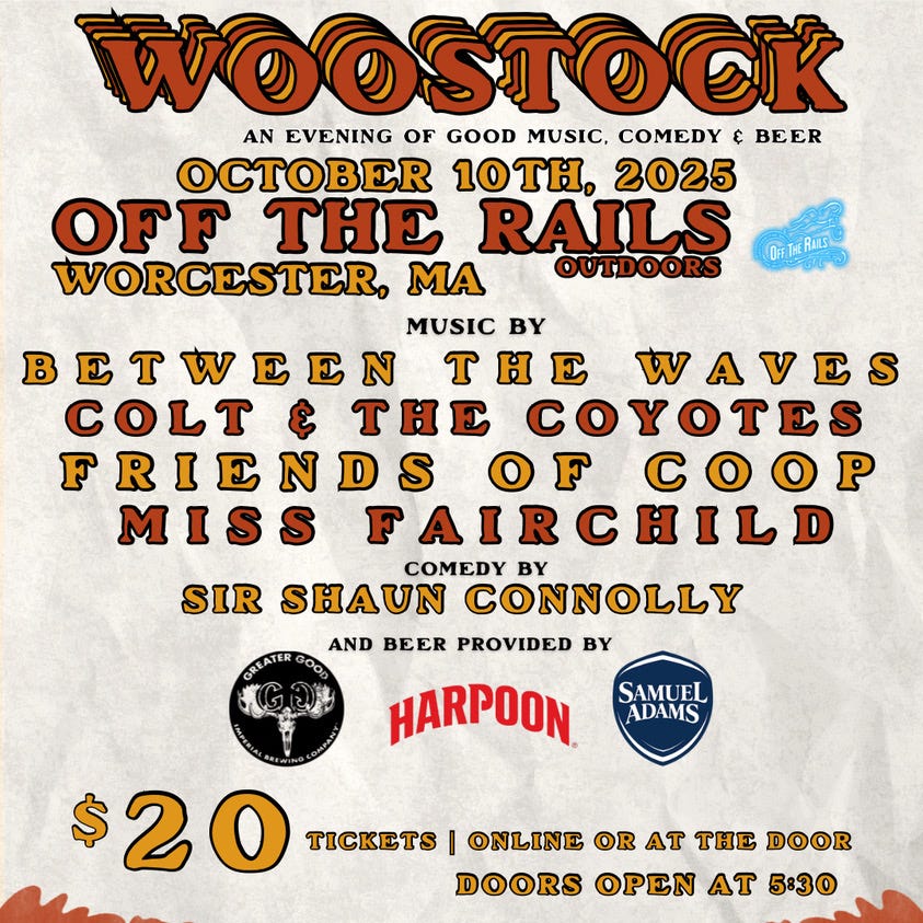 This Friday, I will be hosting the first ever Woostock at Off the Rails. There are four great bands playing, Between the Waves, Colt and the Coyotes, Miss Fairchild, and Friends of Coop. There will be food and beer. There will be vendors. There may be an alpaca there? I will be telling jokes and and hosting contests in between bands. It is outdoors, so come enjoy one of the last nice nights until we hunker down this winter.