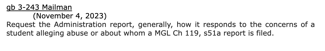No one else spoke. But that was three official policy directives from School Committee members prompted by the story. And then there was a fourth, briefly discussed afterward.