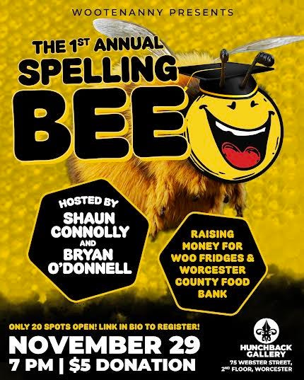 This Saturday is the Spelling Bee at Hunchback Gallery! This is going to be so much fun. We currently have 17 competitors and lots of tricks up our sleeve. Come on out, it is a fundraiser for the Worcester County Food Bank and Worcester Free Fridges. You won’t regret it!
