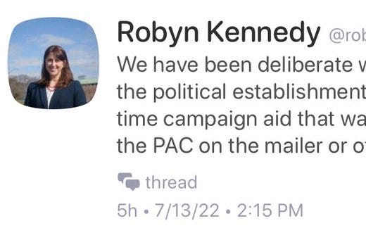 The headlines reach many more people than the text of the article—little pieces of internet ephemera, passively consume. Just another wave in a rolling sea of information and the only takeaway without investigating further is the association of “Robyn Kennedy” with “investigation” and “campaign finance.” Sounds bad!