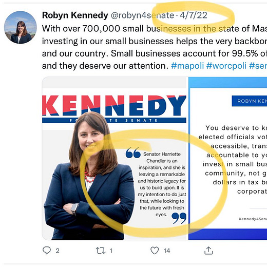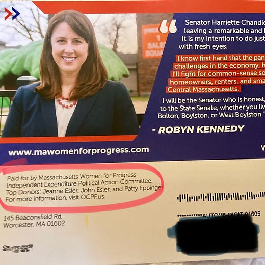 So Petty’s campaign announced earlier this week that it is requesting a campaign finance investigation into his opponent, Robyn Kennedy, and a fundraising committee supporting her campaign. In a statement sent to local press (not to me, btw!) Petty said he’s requesting the state Office of Campaign & Political Finance to look at Kennedy’s campaign war chest, a recent campaign mailer and a political action committee called Massachusetts Women for Progress. It’s important off the bat to note that people who don’t pay much attention to politics or otherwise consume political media on a surface level might instinctively associate “political action committee” with the “super PAC” and “dark money” narratives which surround presidential campaigns. A political action committee is a standard campaign tool used by good guys and bad guys alike toward both good and bad ends. The existence of a political action committee is not in and of itself a cause for concern. I make the point because it seems a good chunk of Petty’s argument seems to rest on the belief that people will hear “PAC” and think “bad.”