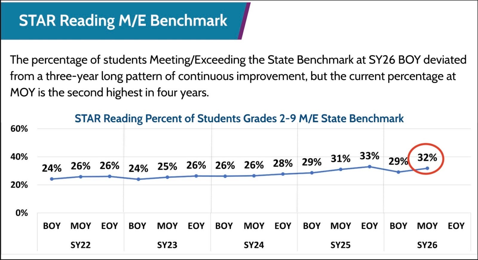 According to Star assessments1 for grades 2 through 9, reading and math both increased by three percentage points at midyear. Reading remains at its highest midyear level to date, though the district will need an additional four-point gain by the end of the year to meet its target. Math performance is also at its highest level since tracking began.