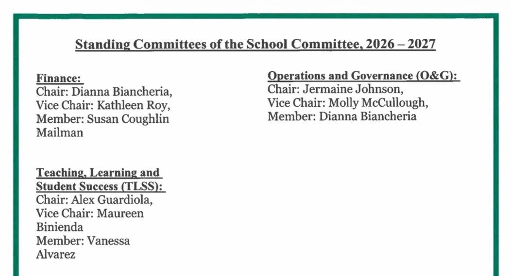 At the January 2 meeting, Molly McCullough (district A) was elected vice chair in a 7-2 vote (Vanessa Alvarez and Sue Mailman voted for Mailman, and coincidentally are the only two school committee members who are not chairs or vice chairs of a subcommittee).3 McCullough is the granddaughter of a Worcester mayor and has worked on Joe Petty’s Mayoral campaigns for many years. She is the second longest serving school committee member, after Dianna Biancheria. This is McCullough’s second time being vice chair (she was vice chair in 2019, although the vice chair position back then was not the same as it is now.) The main job of the vice chair is working with the clerk and the superintendent to assemble the school committee agenda and to make sure the committee meets with the Student Advisory Council.